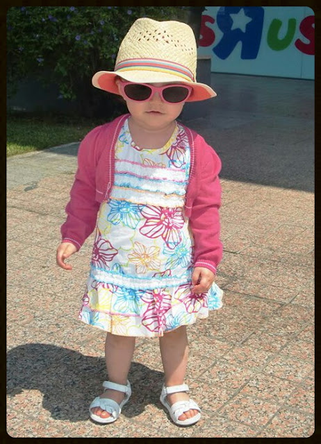Baby Lara veste: vestido da Kid to Kid: marca ñ identificada/ bolero: Benetton/ óculos: chicco/ chapéu: H&M/ sandálias: zara baby